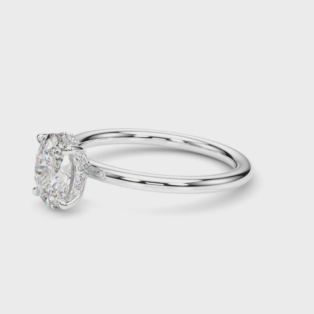 Capture her heart with this stunning 2CT TW Hidden Halo Oval Lab-Grown Diamond Engagement Ring crafted in 18K White Gold. Comes with an IGI Certificate and a free Signature Gift Box, it is the perfect symbol of love for your special someone. Allow one week for us to custom make this ring just for you.